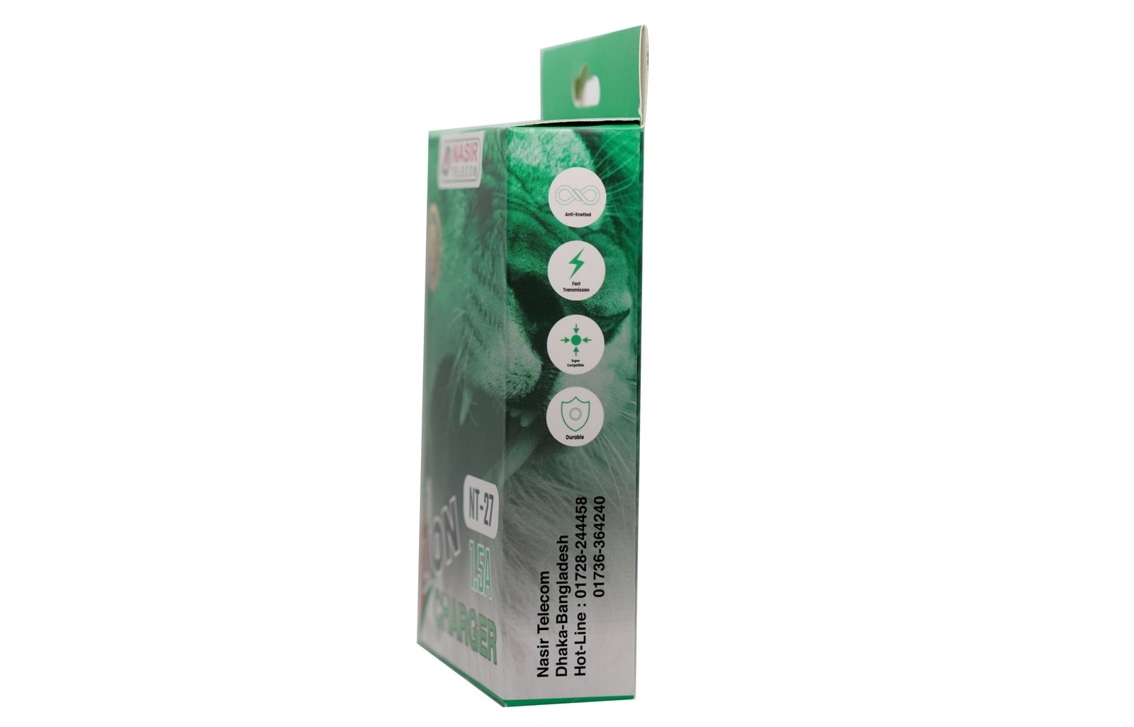 The NT-27 Lion Charger features 1.5A output, a built-in cable, and an extra USB port for dual charging. It offers fast, stable performance with 6 months official guarantee from Nasir Telecom.